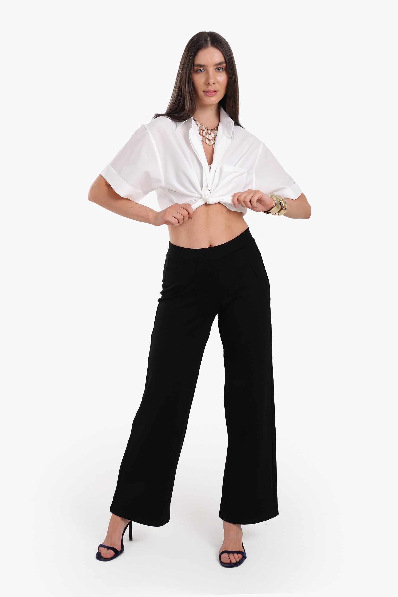 اكتشفي الراحة والأناقة اليومية مع بنطلون الجيرسي الأسود الذي يجمع بين العملية والستايل العصري. مصنوع من قماش جيرسي ناعم ومرن يمنحك إحساساً فائقاً بالراحة طوال اليوم. يتميز بتصميم سادة وقصة مريحة تنسدل بانسيابية مع أرجل واسعة تمنحك حرية الحركة وأناقة في كل خطوة. يضمن الخصر المطاطي ثباتاً مريحاً دون تقييد، كما أن الطول الكامل يمنح إطلالتك مظهراً أطول وأكثر أناقة. تصميمه العملي بدون أزرار أو سحابات يجعله سهلاً في الارتداء ومثالياً للاستخدام اليومي سواء في المنزل أو أثناء الخروج بإطلالة كاجوال أو حتى عند تنسيقه مع قطع أنيقة لإطلالة بسيطة ومميزة.