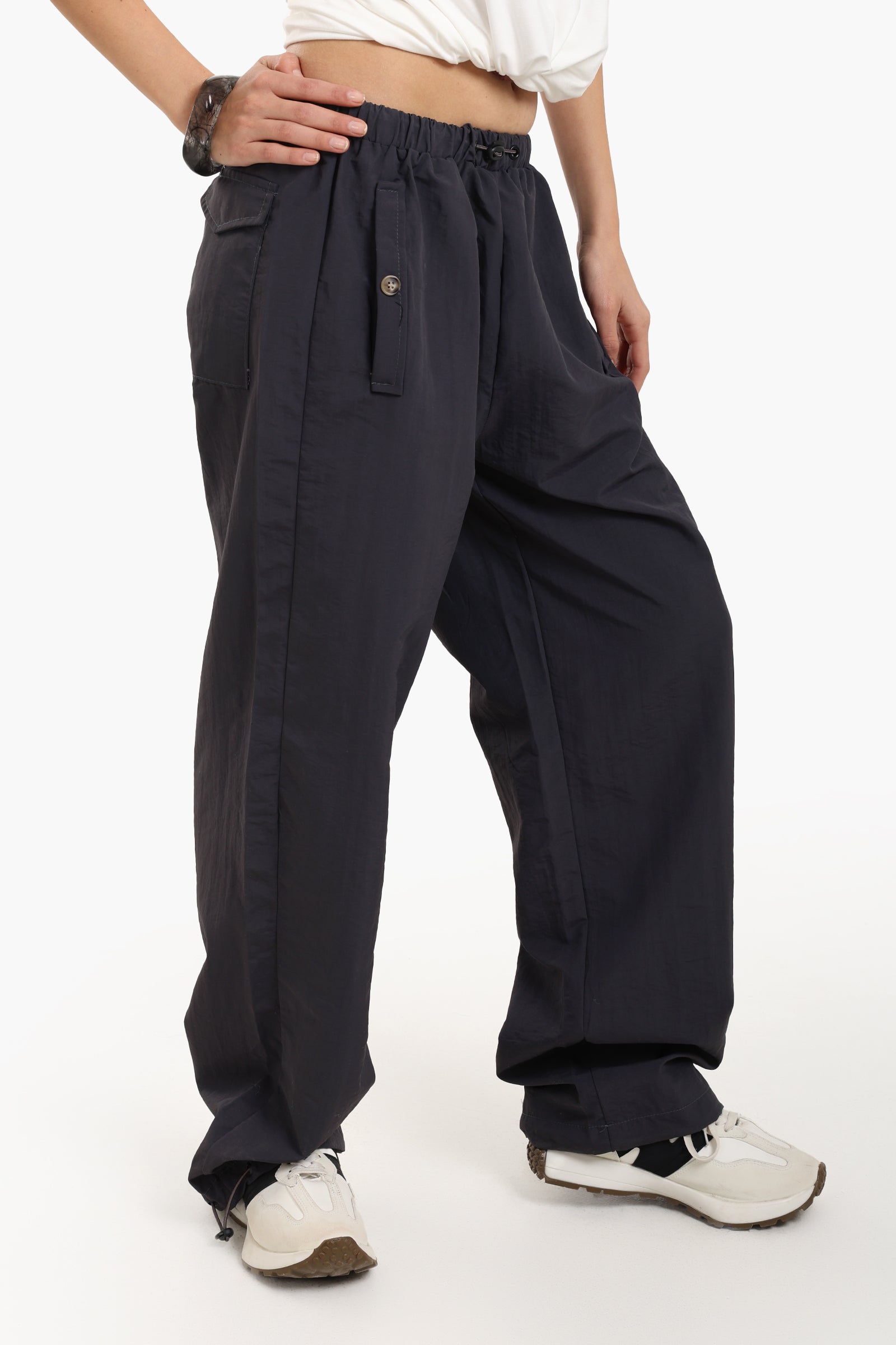 البنطلون لونه رمادي غامق بقصة مستقيمة وأنيقة، وطول كامل، يناسب أي وقت من اليوم. الوسط عالي ومطاطي، ومعاه رباط لتضبيط المقاس، وكمان فيه جيوب جانبية بزرار عشان تحطي موبايلك أو مفاتيحك بأمان.