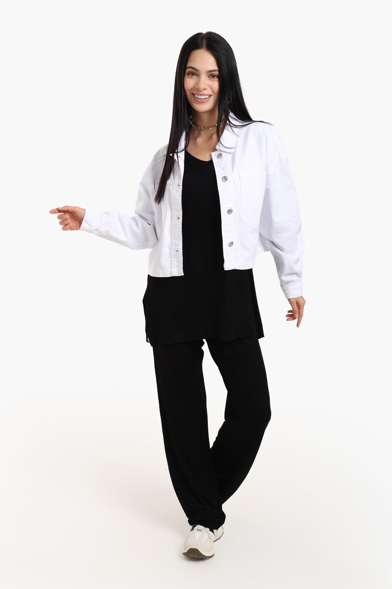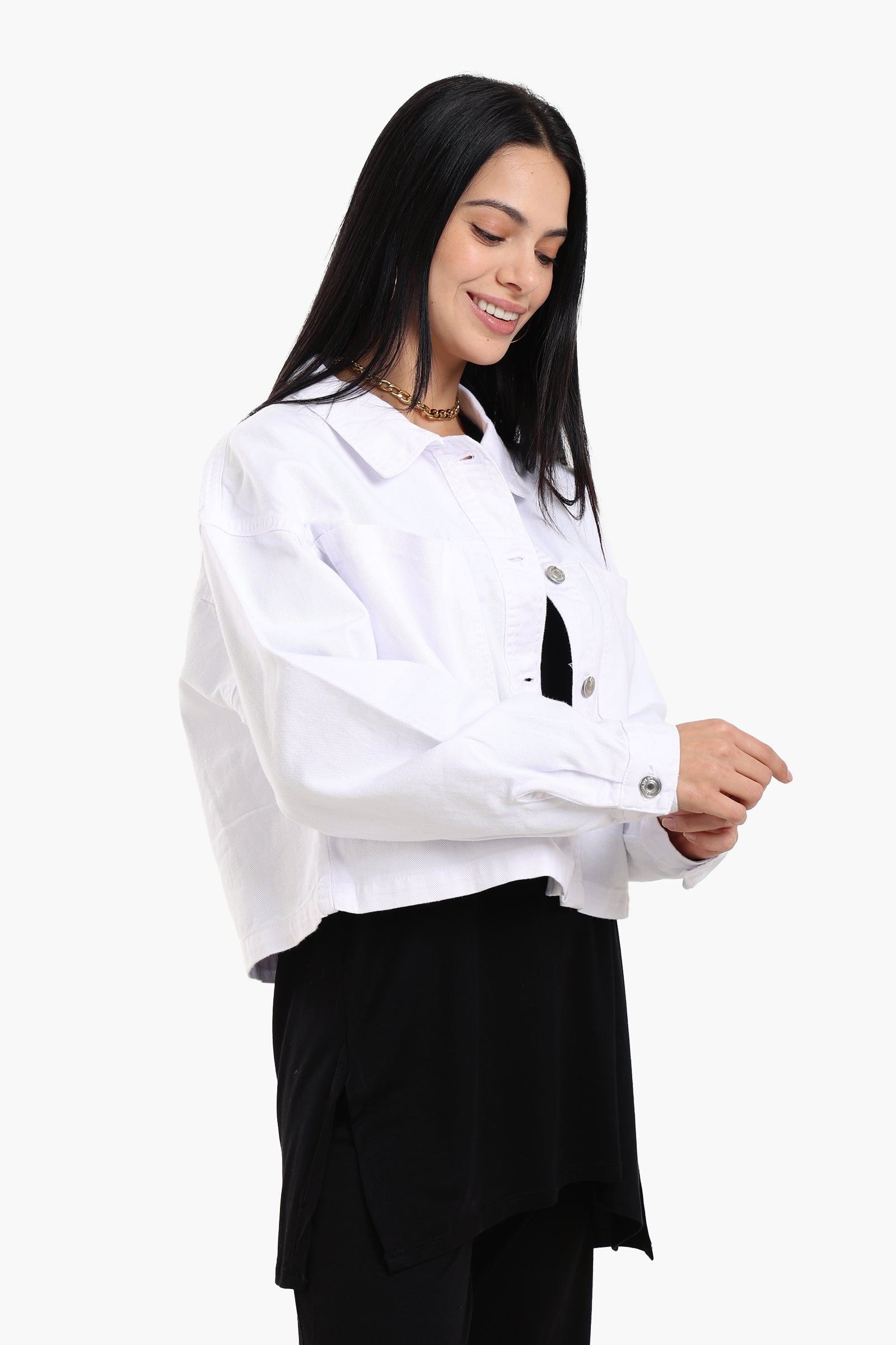 أعيدي تعريف الأناقة الكاجوال مع هذا الجاكيت الجينز القصير الذي يجمع بين التصميم الكلاسيكي واللمسة العصرية. مصنوع من قطن بجودة عالية. ويوفر قصة مريحة مع ياقة كلاسيكية وصف أزرار أمامي كامل. تأتي تفاصيل الكتف المنخفض لتضفي طابعاً عملياً ومريحاً على التصميم، بينما يضيف الطول القصير لمسة جذابة تبرز شكل الجسم بطريقة أنيقة. يتميز الجاكيت بوجود جيبين عمليين على الصدر لدمج الوظيفة مع الأسلوب، مما يجعله قطعة أساسية مثالية للتنسيق مع إطلالات متعددة عبر جميع المواسم.