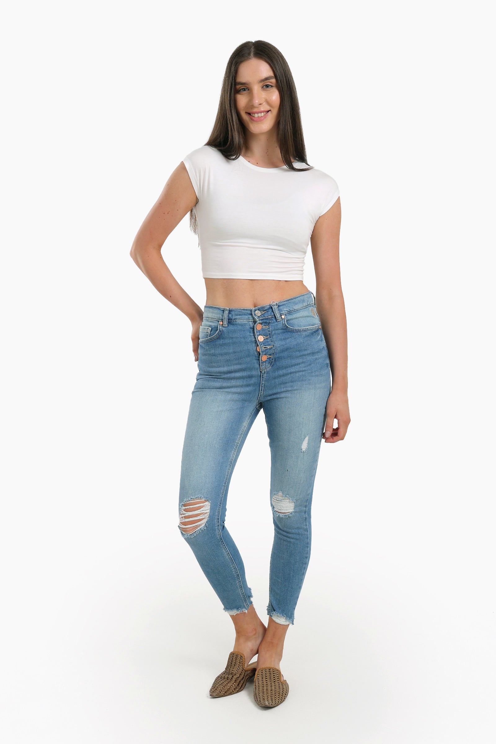 ارتقي بإطلالتك الكاجوال مع هذا الجينز السكينّي الممزق بطول الكاحل، المصمم بقصة ضيقة تبرز القوام، ومصنوع من قطن ناعم مطاطي يمنحك الراحة طوال اليوم. يتميز بلونه السادة الذي يتيح لك تنسيقه بسهولة مع مختلف الإطلالات، بينما تضيف التفاصيل الممزقة والحافة المهترئة لمسة جريئة ومتمردة. يتميز بإغلاق مبتكر بـ5 أزرار وسحاب، وتصميم عملي بخمسة جيوب، ليجمع بين الأناقة والوظيفة. طوله الذي يصل للكاحل يجعله مثالياً لإبراز حذائك المفضل.