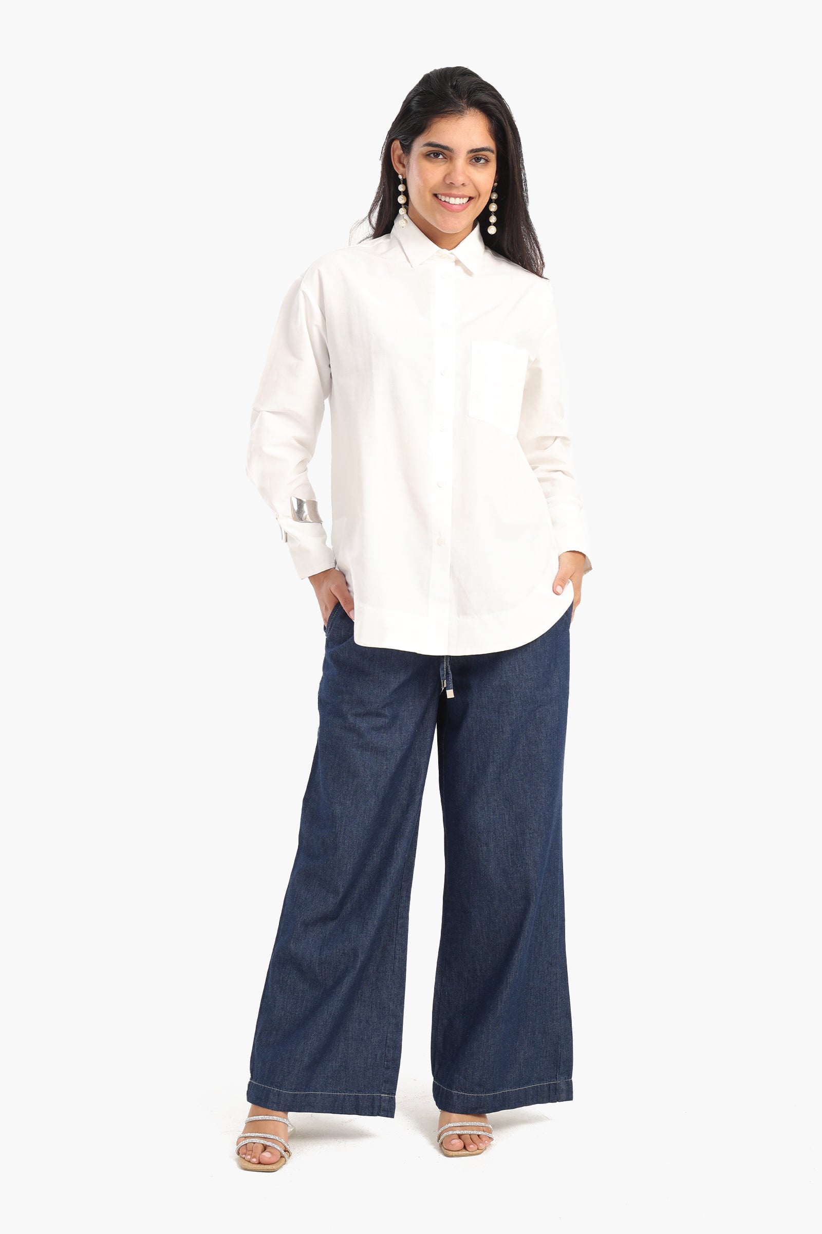 جددي إطلالتك اليومية مع هذا القميص الواسع المصنوع من قماش الفيسكوز الناعم والمريح. يتميز القميص بقماش خفيف يسمح بالتهوية، ما يجعله مثالياً للارتداء طوال اليوم مع مظهر أنيق وعصري. التصميم السادة مع القصة الواسعة يجعله قطعة متعددة الاستخدامات تناسب الإطلالات الكاجوال والرسمية البسيطة.يأتي القميص بياقة كلاسيكية مع أزرار أمامية كاملة، وأكمام طويلة تضيف لمسة راقية. كما يحتوي على جيب عملي على الصدر وتصميم بحافة مستديرة مع فرق طول بسيط بين الأمام والخلف يمنحه مظهراً عصرياً وجذاباً. يمكن تنسيقه بسهولة مع البنطلونات أو التنانير ليكون اختيارك المناسب لأي وقت.