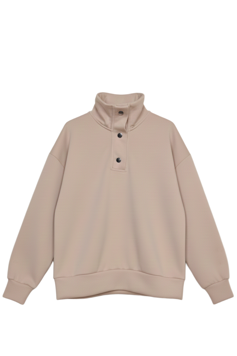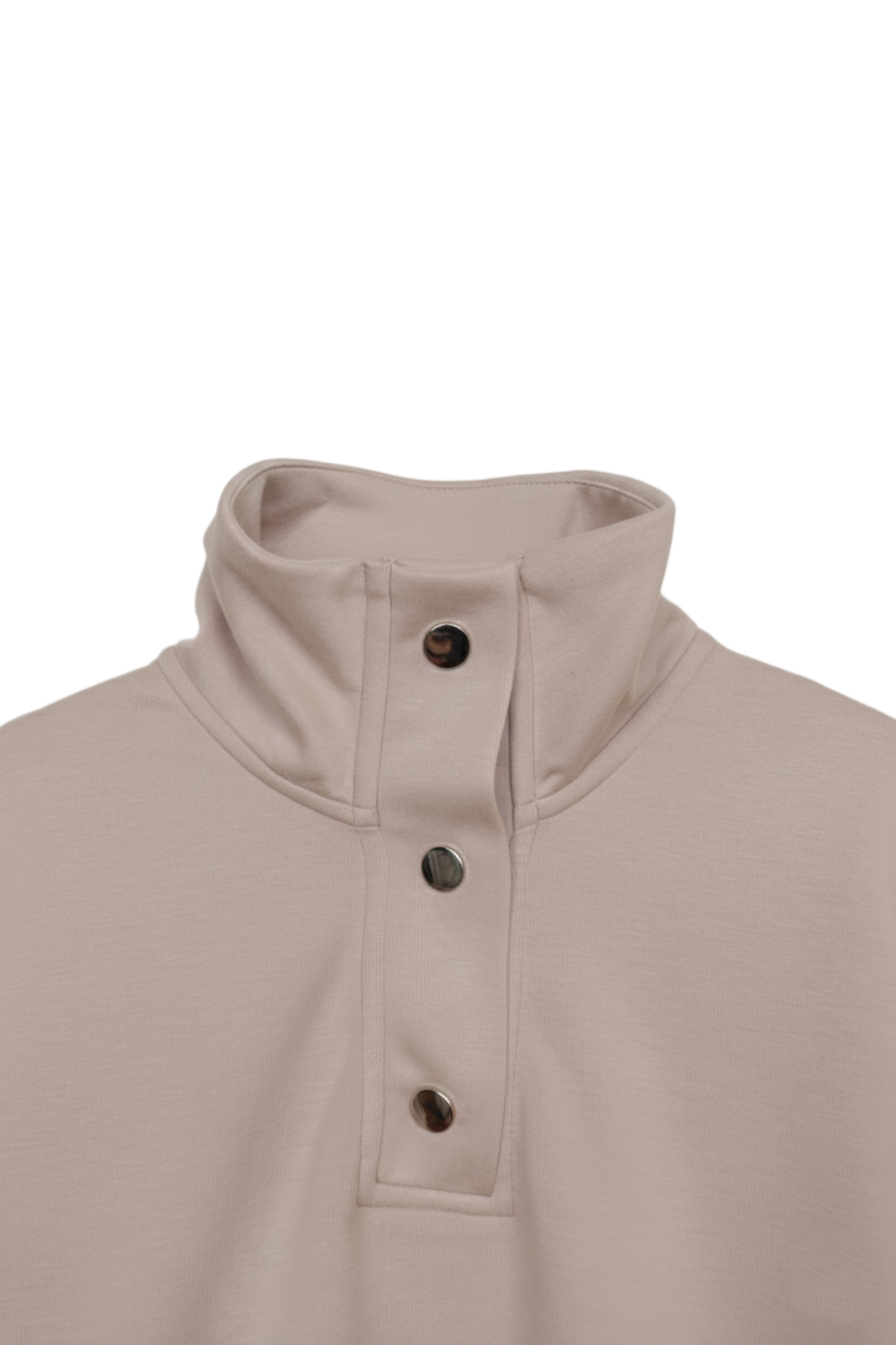 تمتعي بالراحة والأناقة بسهولة مع هذا السويت شيرت اللاونج بقصّة مريحة، المصنوع من مزيج القطن الناعم ليمنحك شعوراً بالراحة طوال اليوم. يتميز بياقة عالية مع إغلاق بأزرار لإضفاء لمسة عصرية بسيطة على إطلالتك الكاجوال. قصة الأكتاف المنخفضة والأساور والحافة المطاطية تمنحك شكلًا دافئًا ومريحًا، ليكون هذا السويت شيرت قطعة مثالية للارتداء السريع في المنزل أو للنزهات المريحة