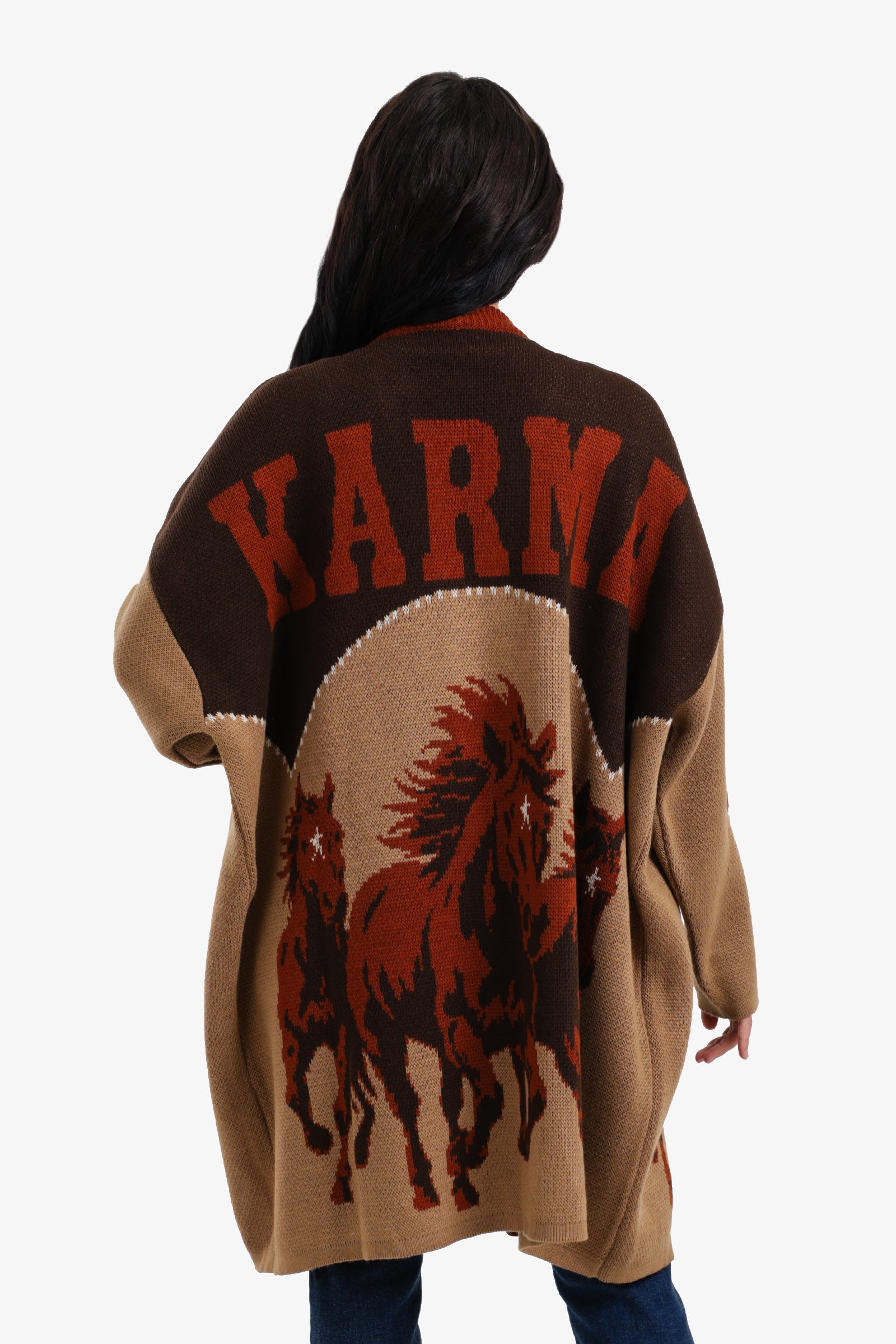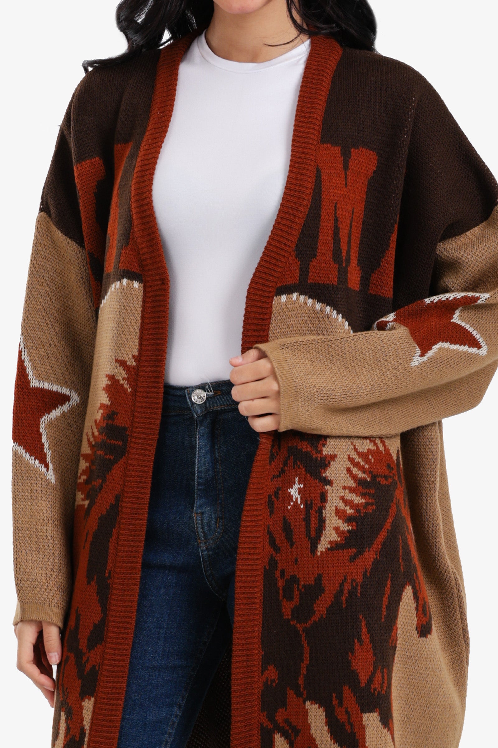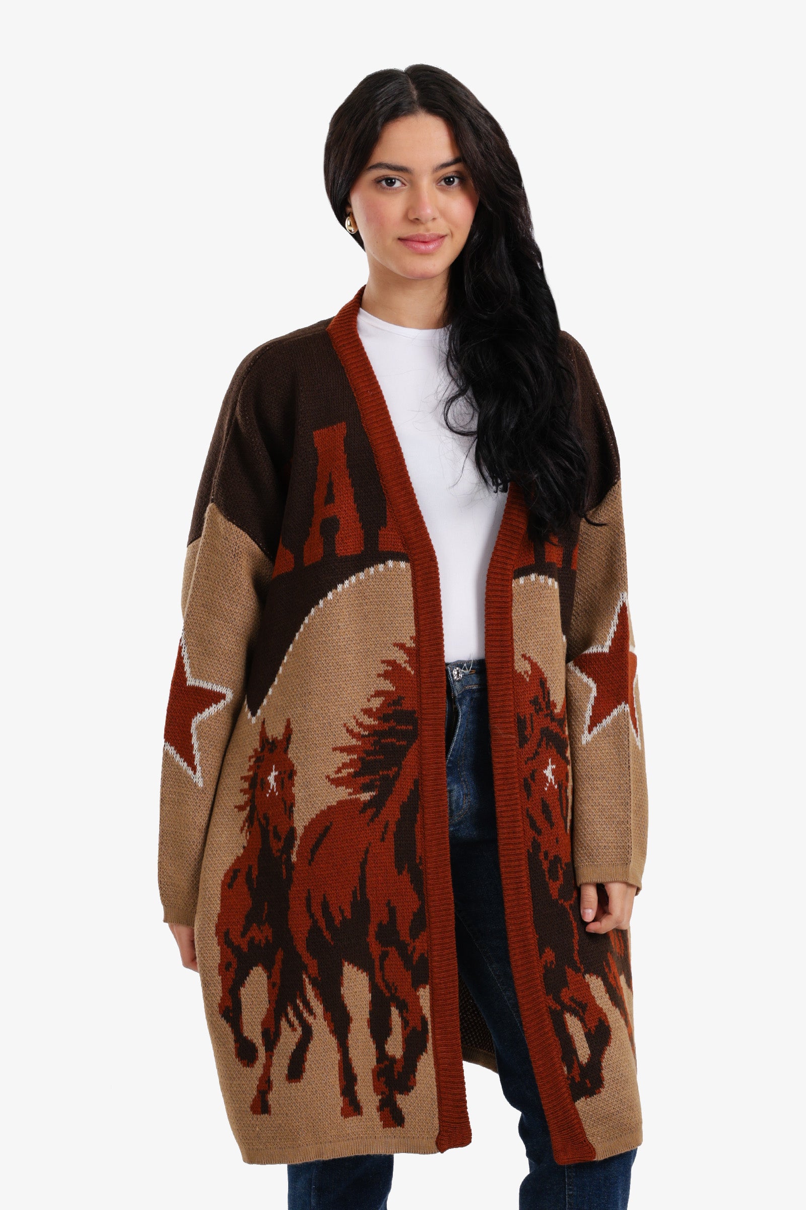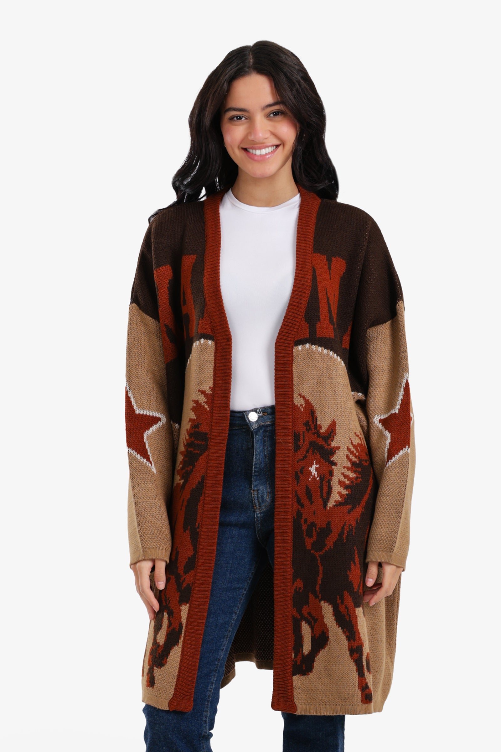 لفتي الأنظار مع هذا الكارديجان المفتوح بطابع غربي. مصنوع من قماش محاك مريح، ويتميز بنقشة جاكار مميزة للخيول والنجوم تضيف لمسة جريئة وأنيقة مستوحاة من الفروسية. تمنحك القصة الواسعة والمفتوحة سهولة في التنسيق والحركة، بينما يجعل الطول الطويل منه قطعة مثالية لإضافة لمسة درامية ودفء لأي إطلالة.