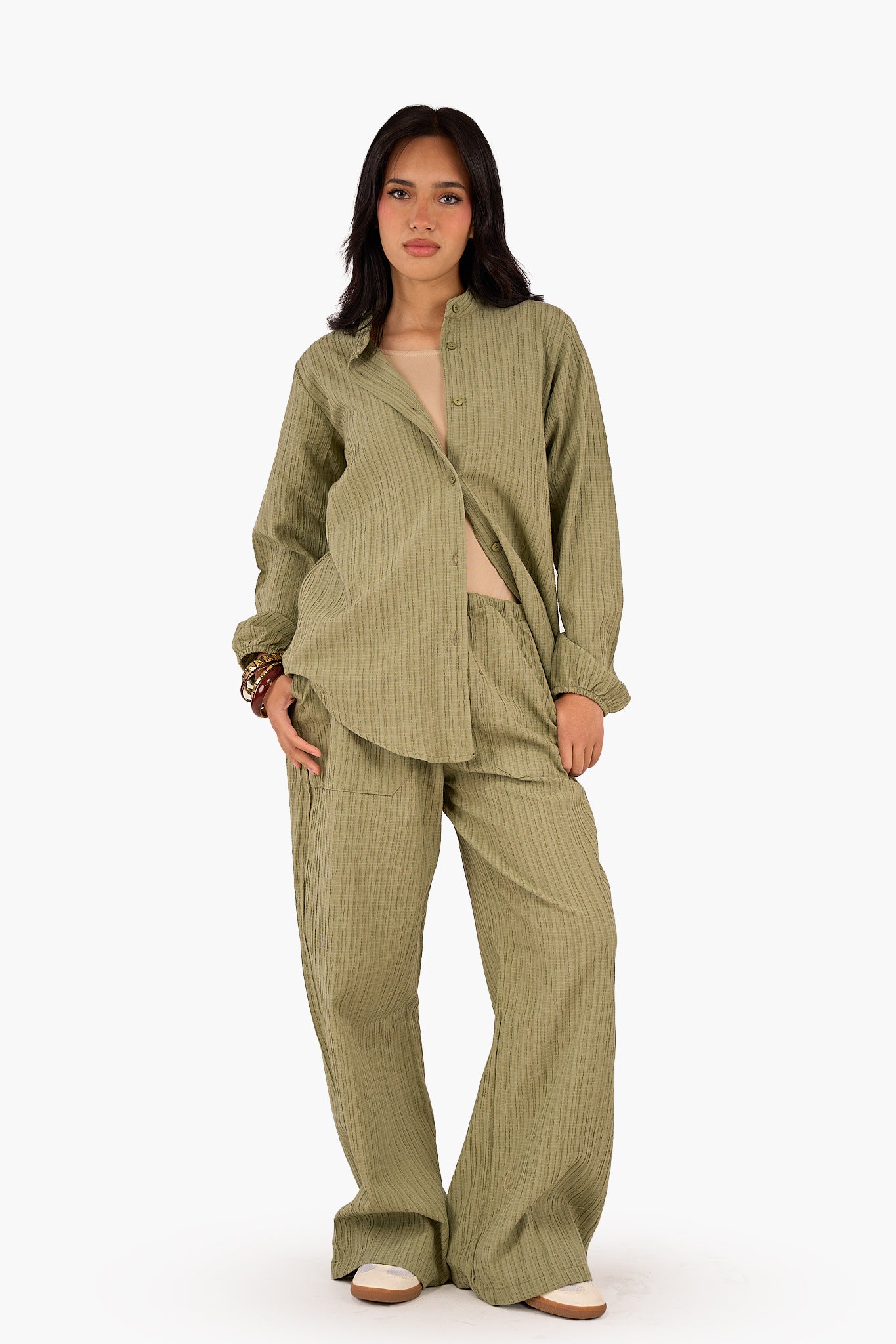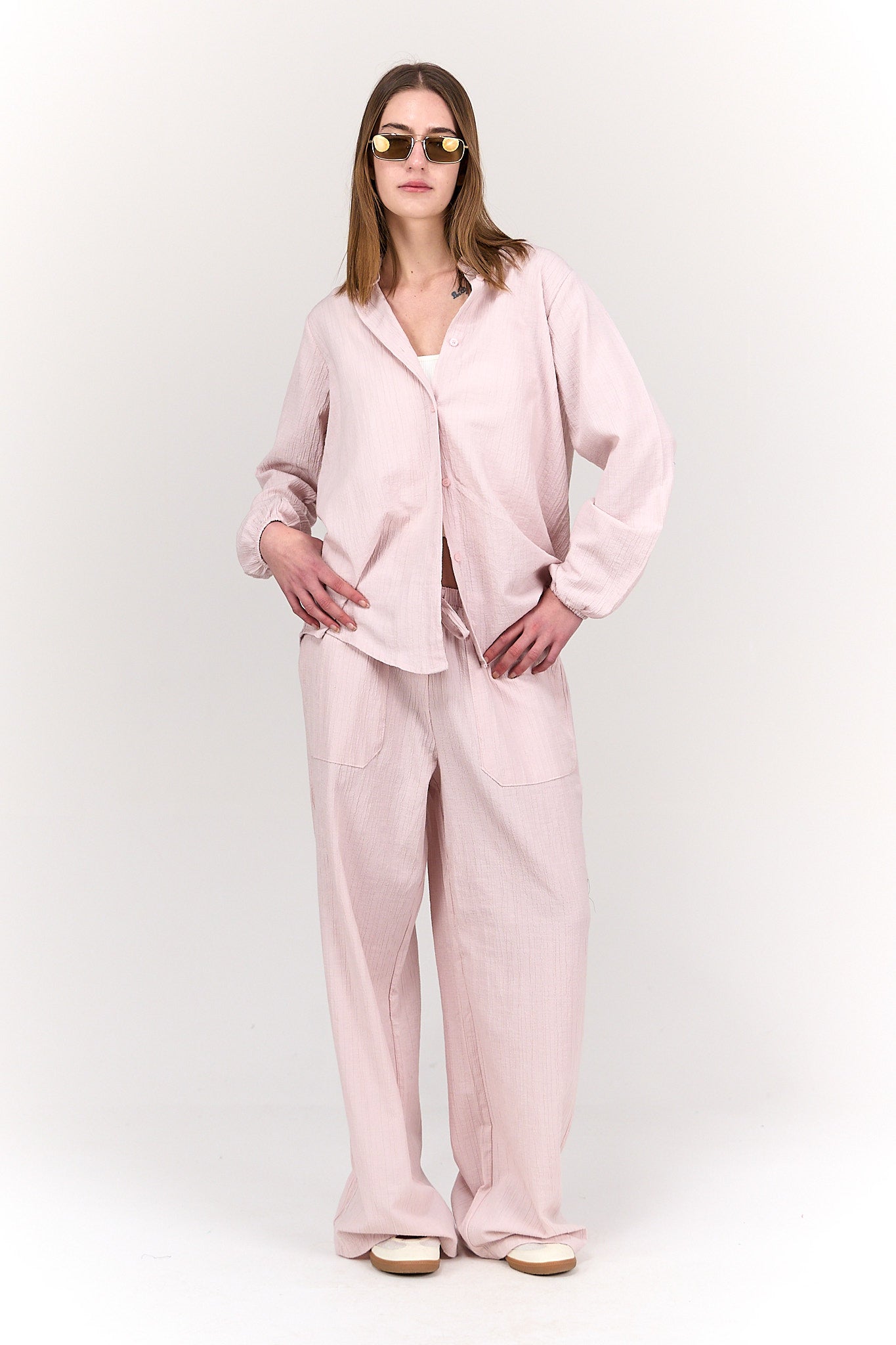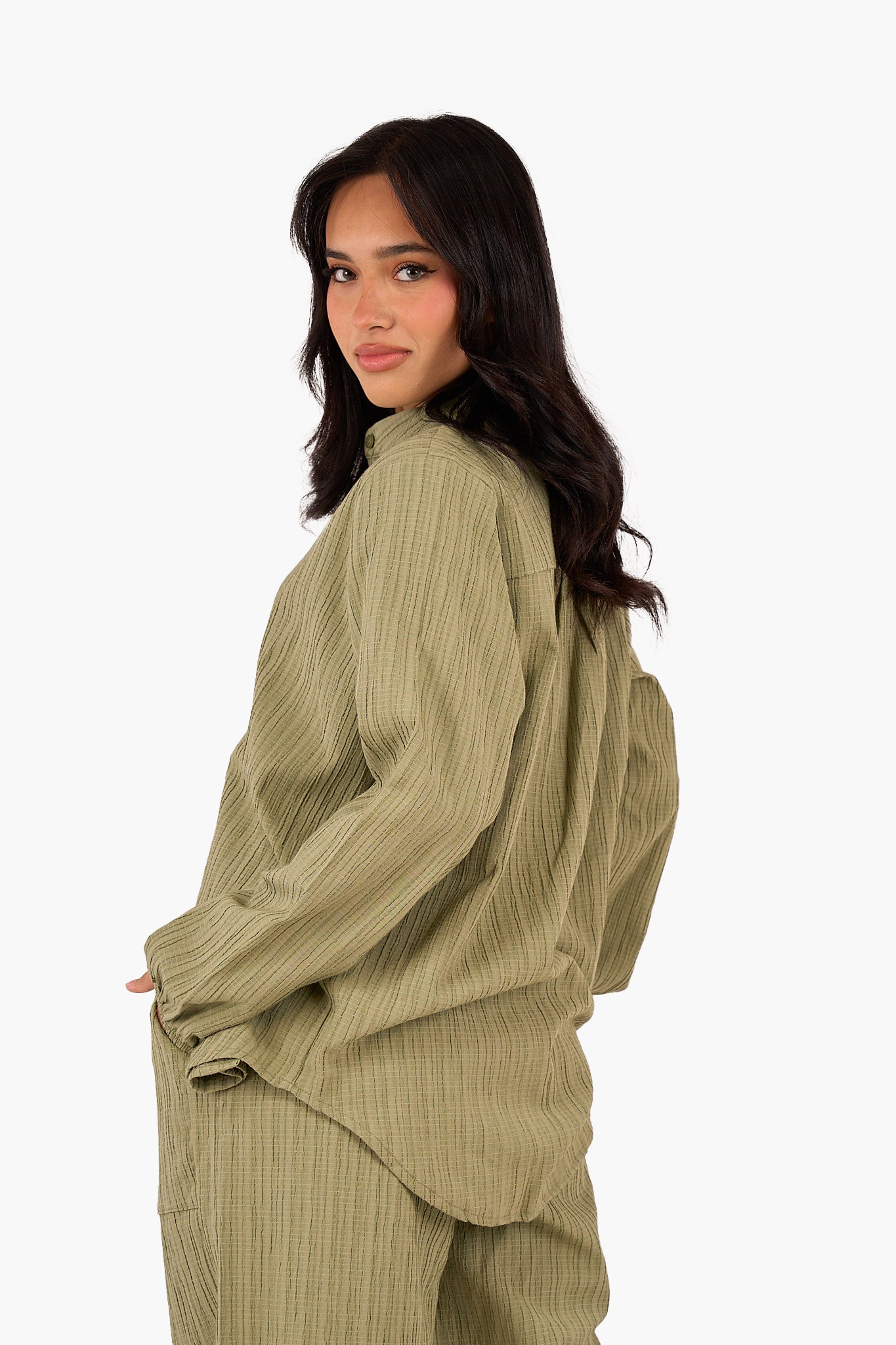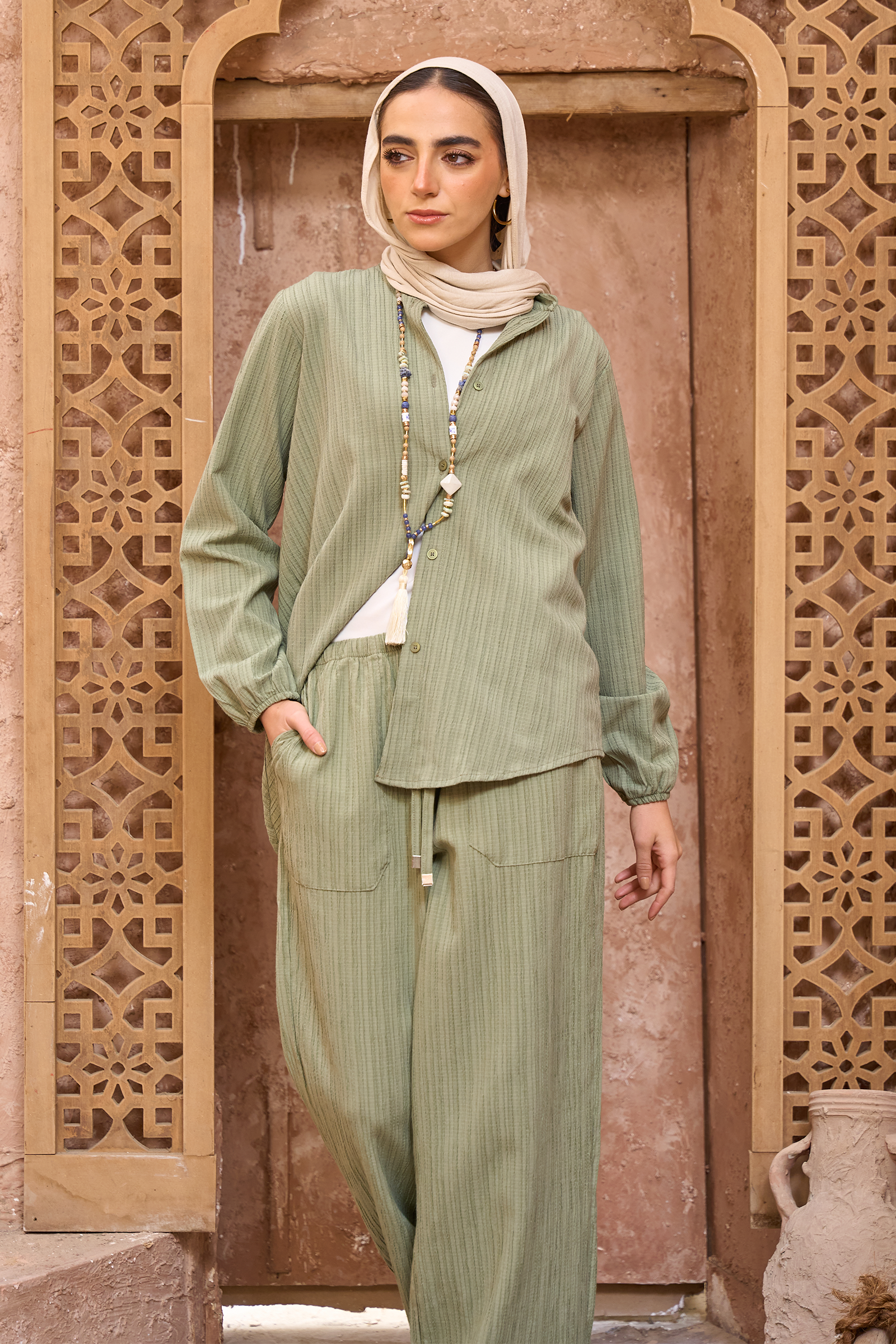 تقدم لكِ كلو قميص تينسل بنقشة رقيقة من نفس اللون المصمم بقصة واسعة توفر الأناقة والراحة. يتميز بياقة قائمة وإغلاق بأزرار مع صف كامل يُضفي مظهراً أنيقًا وتنوعًا في التنسيق، بالإضافة إلى الأكمام الطويلة والحافة الدائرية للمسة مريحة جذابة. القميص سهل الارتداء، ويمكن تنسيقه مع بنطلون من نفس التصميم للحصول على طقم متناسق مثالي للمناسبات الكاجوال والسمارت كاجوال.