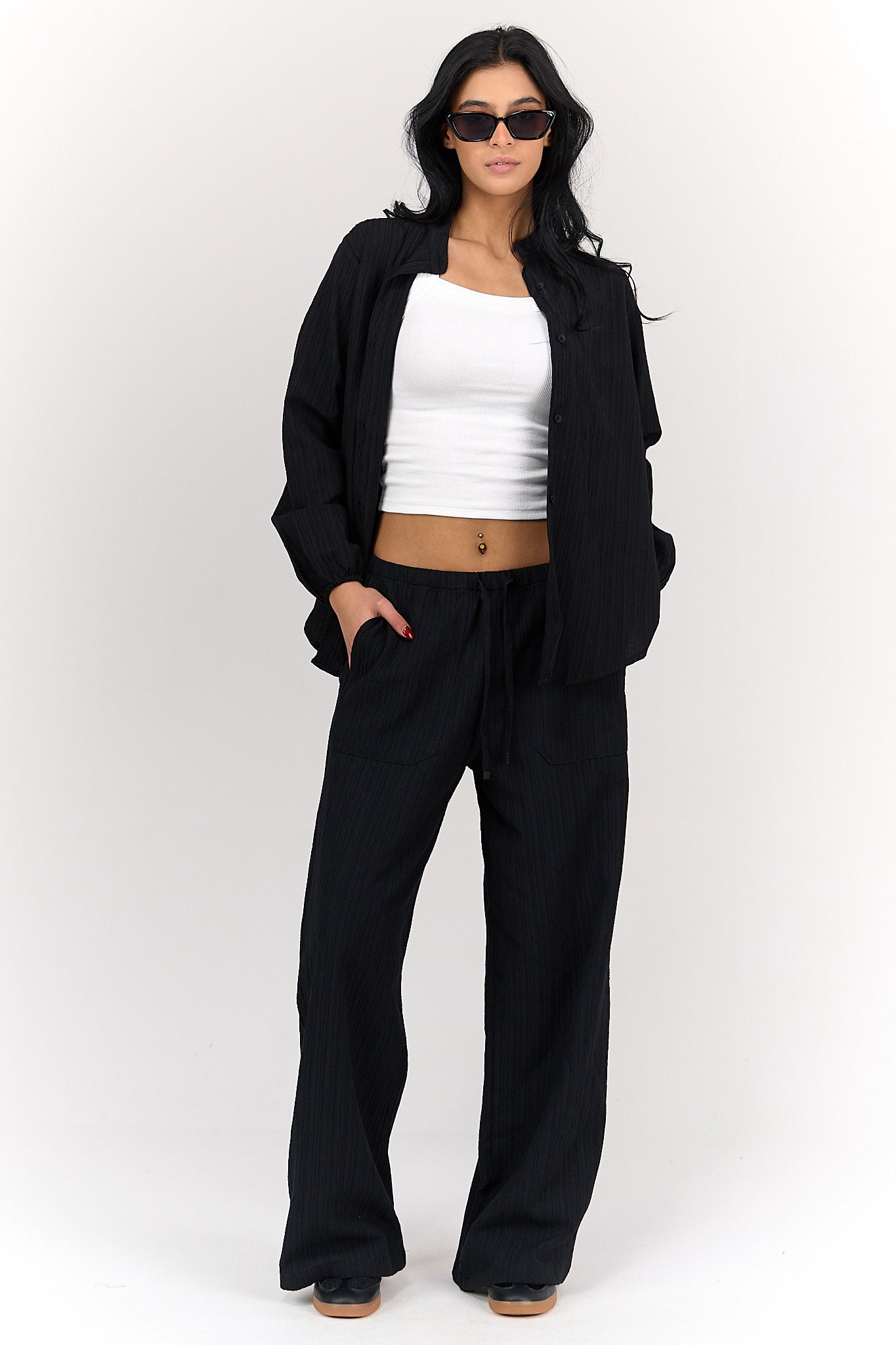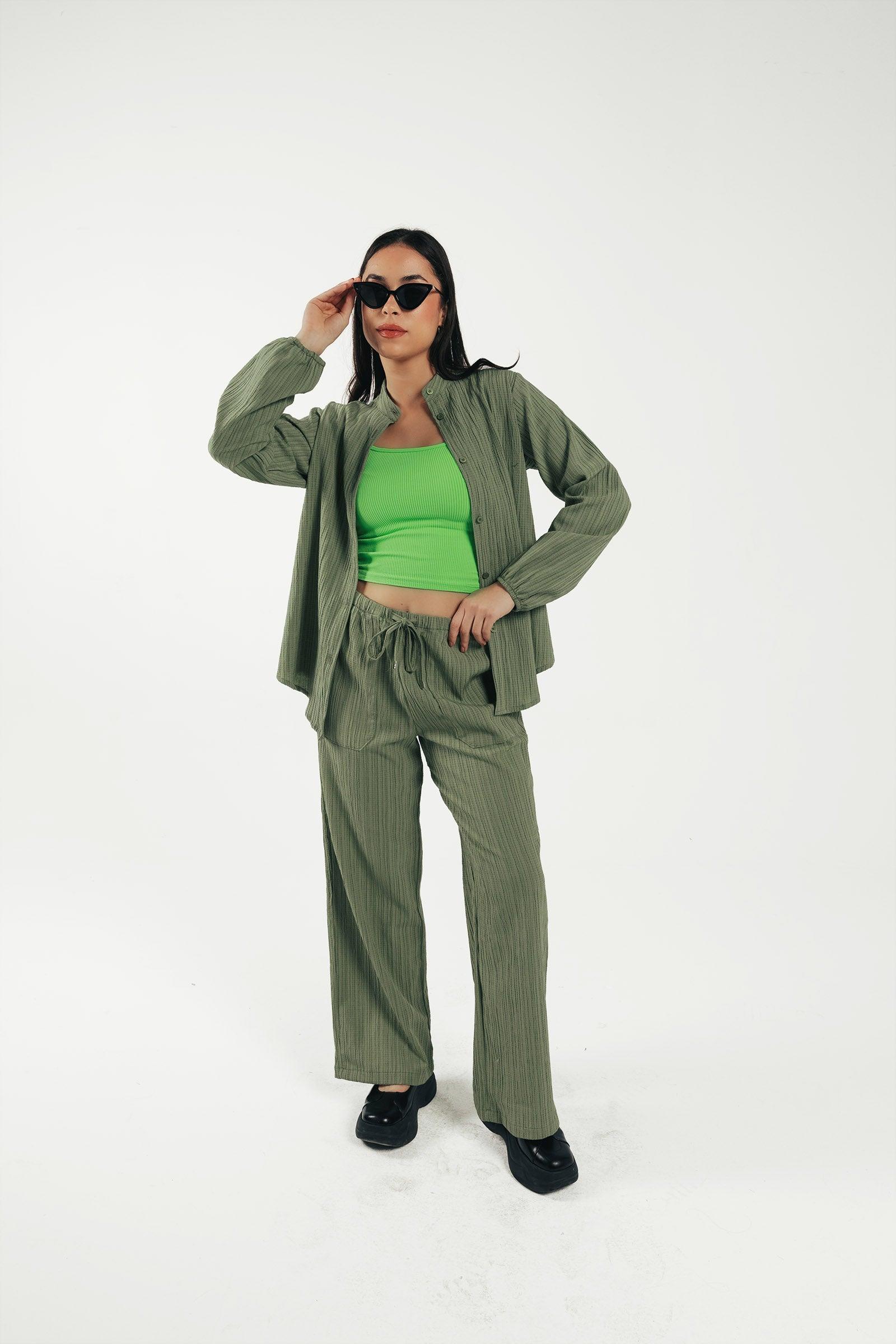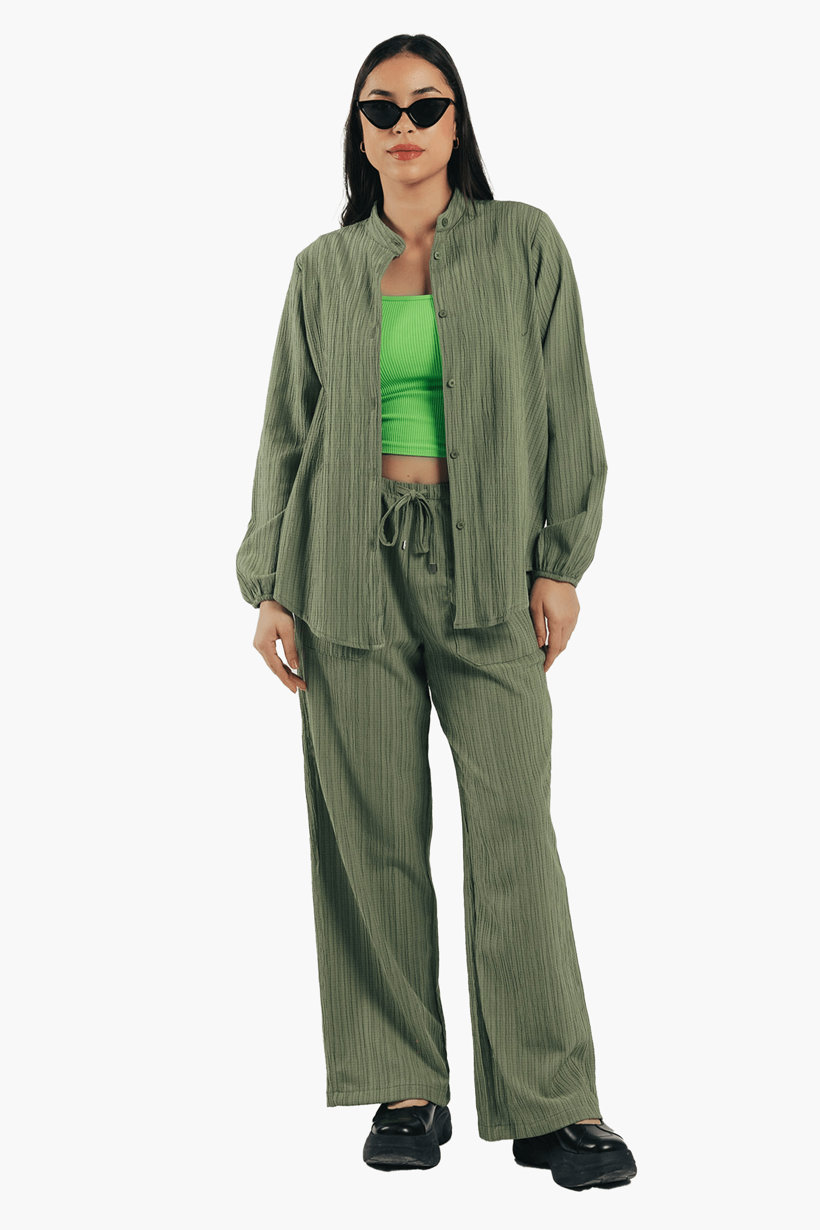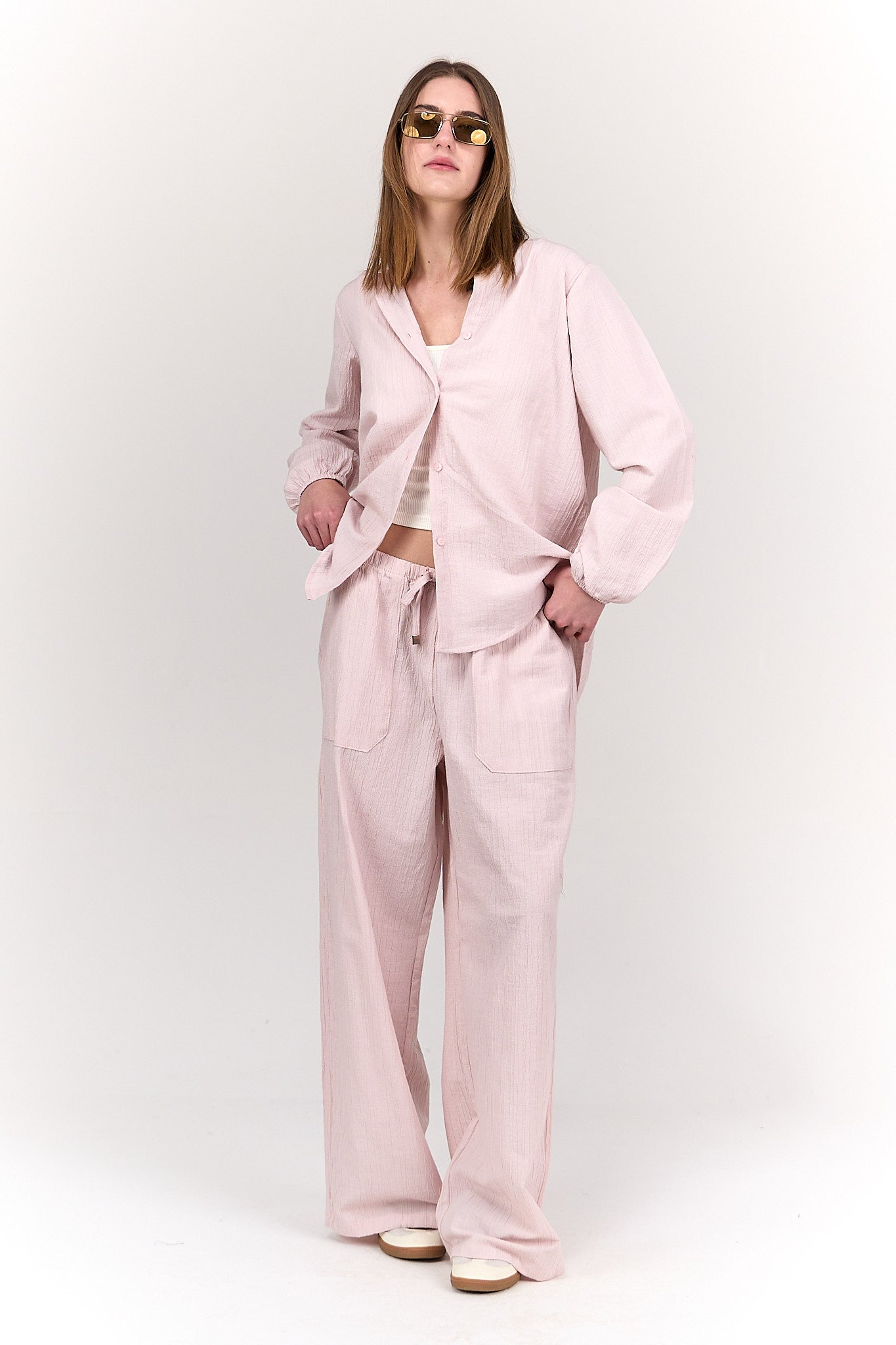 تقدم لكِ كلو قميص تينسل بنقشة رقيقة من نفس اللون المصمم بقصة واسعة توفر الأناقة والراحة. يتميز بياقة قائمة وإغلاق بأزرار مع صف كامل يُضفي مظهراً أنيقًا وتنوعًا في التنسيق، بالإضافة إلى الأكمام الطويلة والحافة الدائرية للمسة مريحة جذابة. القميص سهل الارتداء، ويمكن تنسيقه مع بنطلون من نفس التصميم للحصول على طقم متناسق مثالي للمناسبات الكاجوال والسمارت كاجوال.