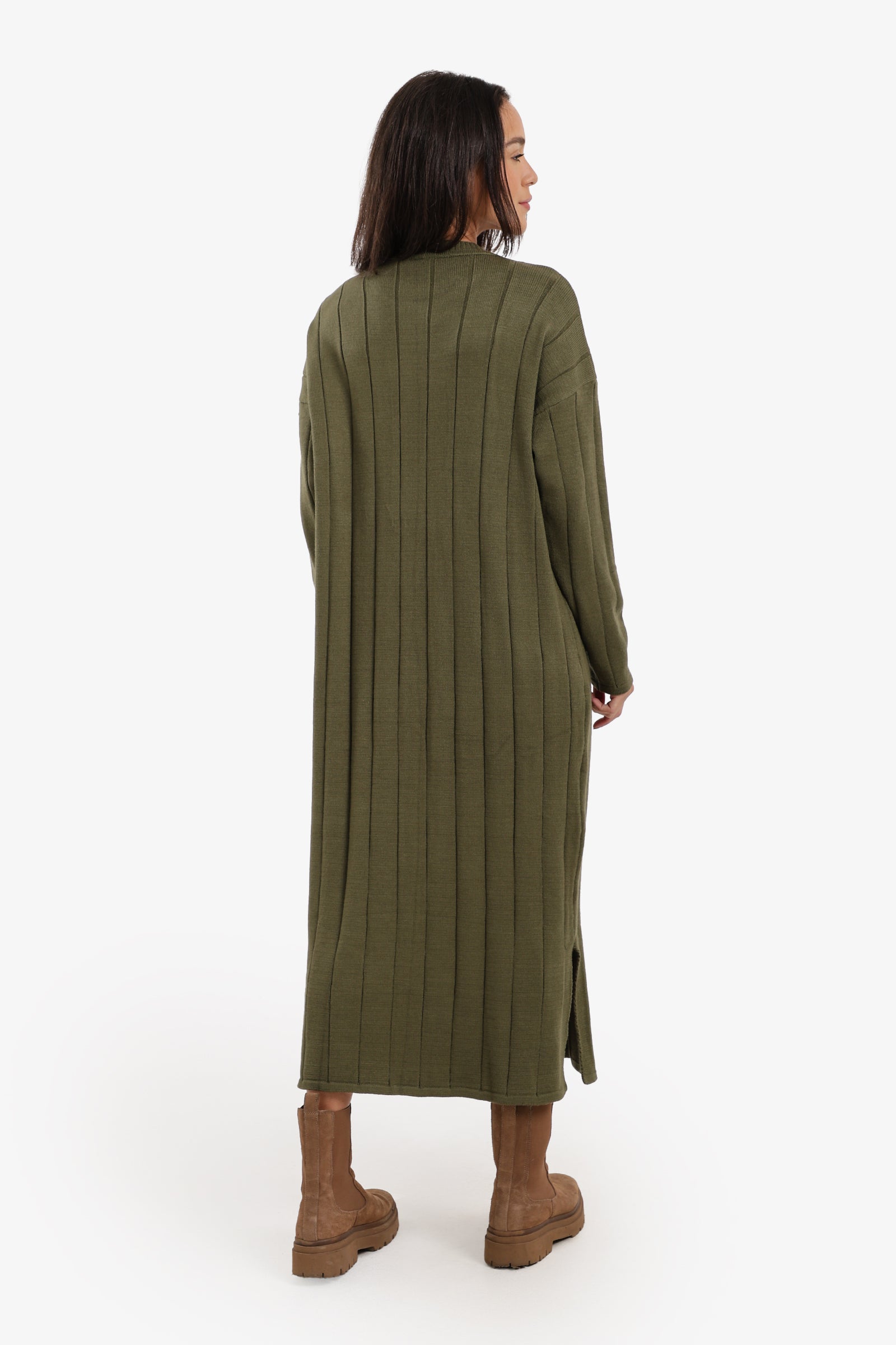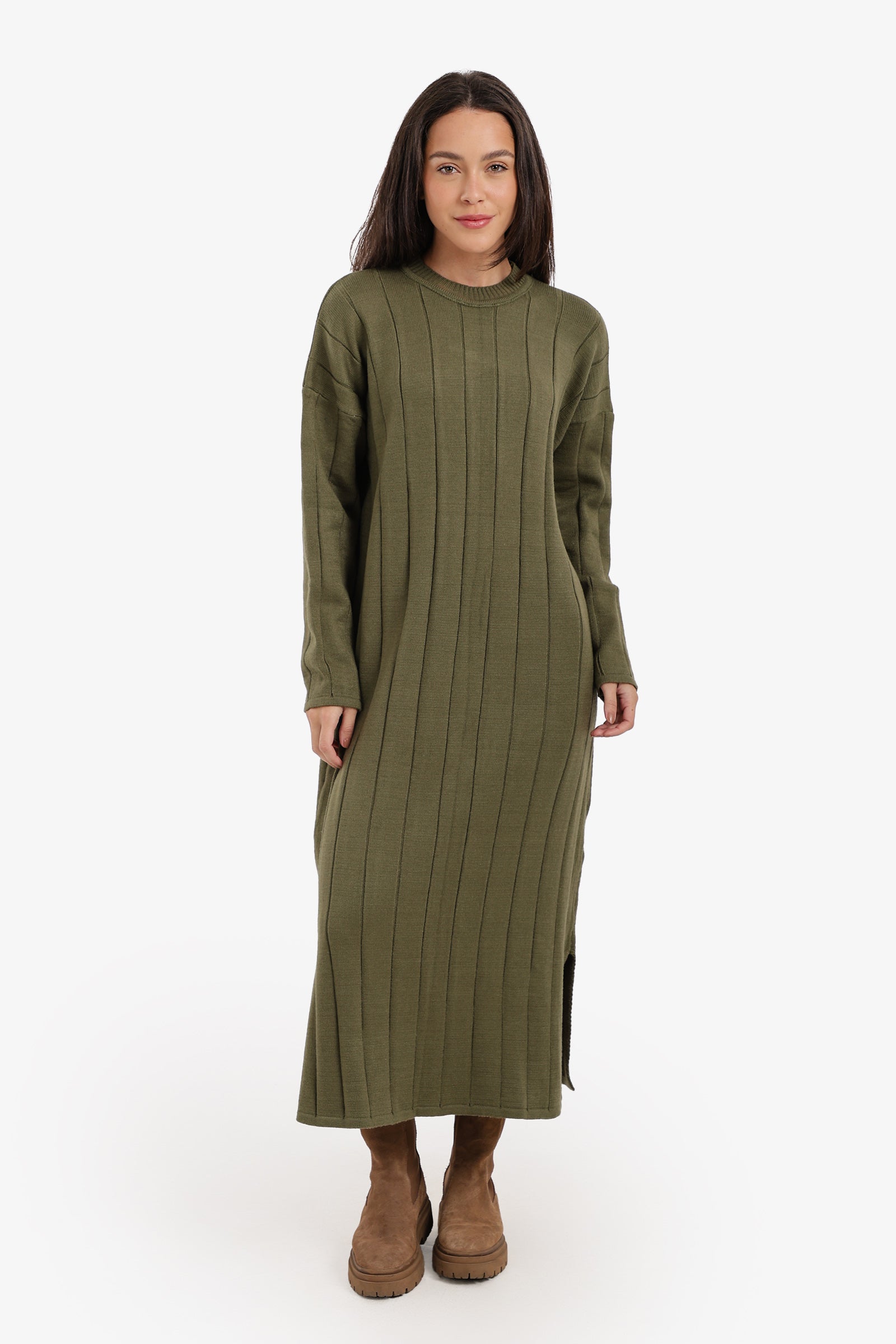 Stay effortlessly chic and cozy in this ribbed crew-neck maxi dress, crafted from soft, luxurious wool for a polished yet comfortable look. Designed with a regular fit and long sleeves, it drapes elegantly while offering ease of movement, making it perfect for both casual days and dressed-up occasions. The subtle ribbed texture adds depth and refinement, while the side slits at the hem bring a modern, flattering twist to the classic maxi silhouette. Ideal for layering or wearing on its own, this dress combines timeless style with contemporary comfort.