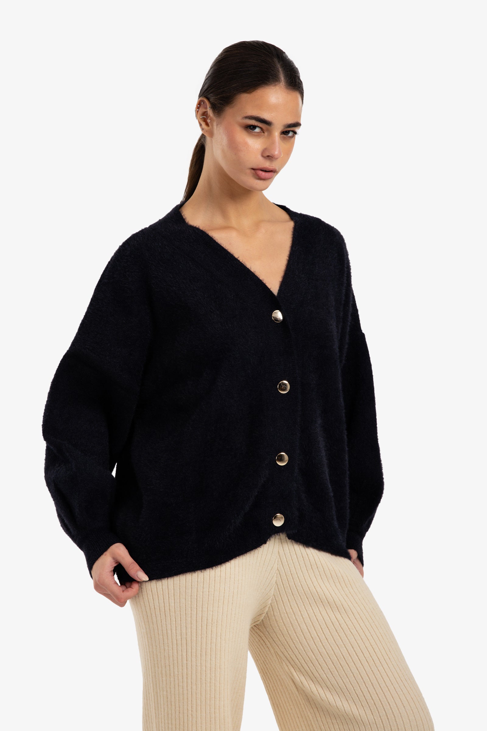 Stay effortlessly chic with this relaxed V-neck cardigan, crafted from soft, fine wool for lightweight warmth and cozy comfort. Featuring a full button-front closure, dropped shoulders, and ribbed cuffs and hem, it offers a streamlined yet relaxed silhouette, perfect for layering over casual or smart-casual outfits.