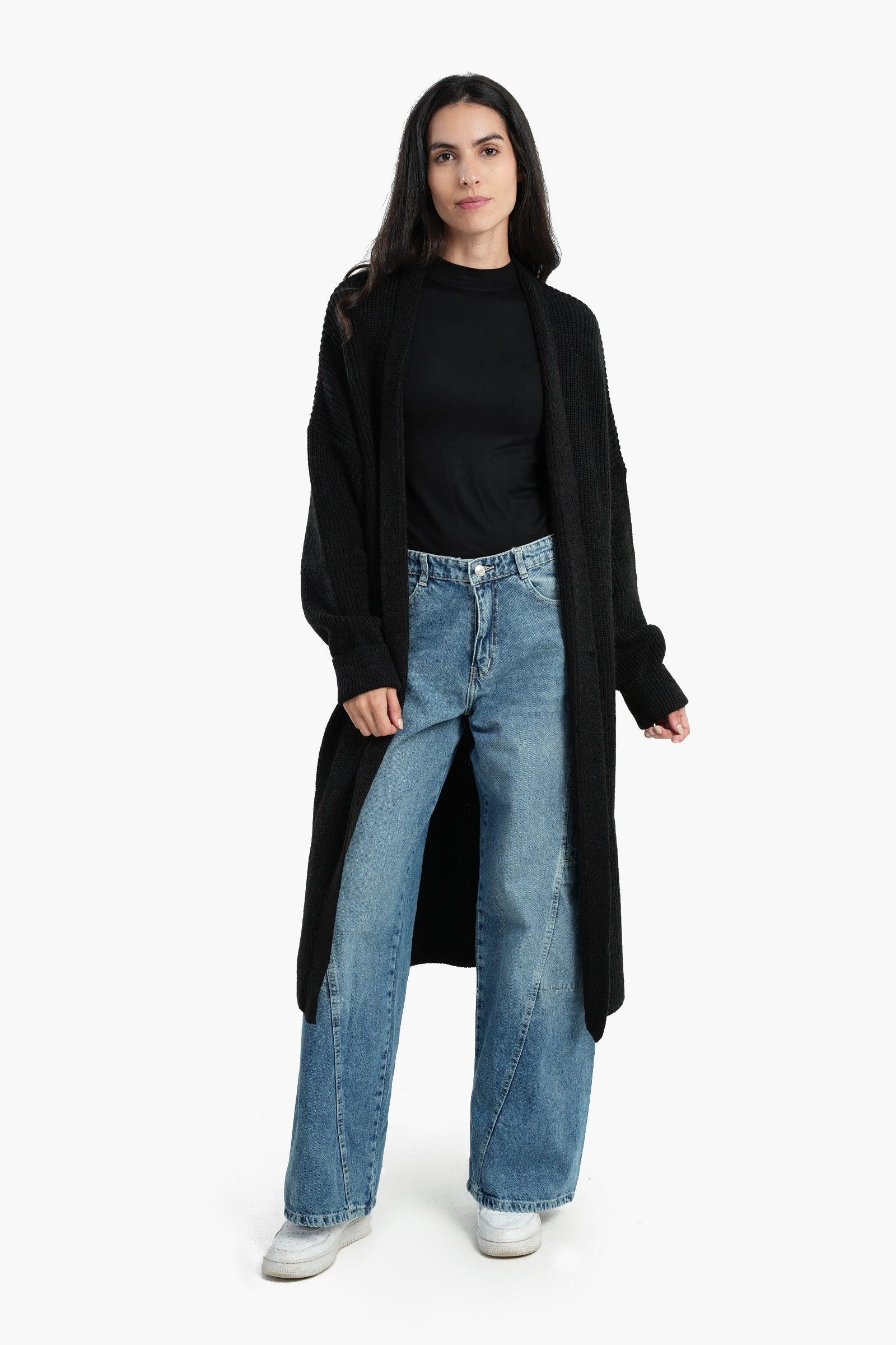 This wool cardigan offers a cozy and stylish solution for cooler days. Featuring a loose fit and a classic knitted pattern, it drapes effortlessly over any outfit, providing both warmth and style. The open neckline allows for easy layering, while the long sleeves with dropped shoulders create a relaxed, laid-back silhouette. The rolled ribbed cuffs add a subtle, yet refined detail to the design. Knee-length for added coverage, this cardigan is perfect for those who seek comfort without sacrificing elegance. Easy to wear, it’s a versatile piece that can be paired with a variety of outfits.