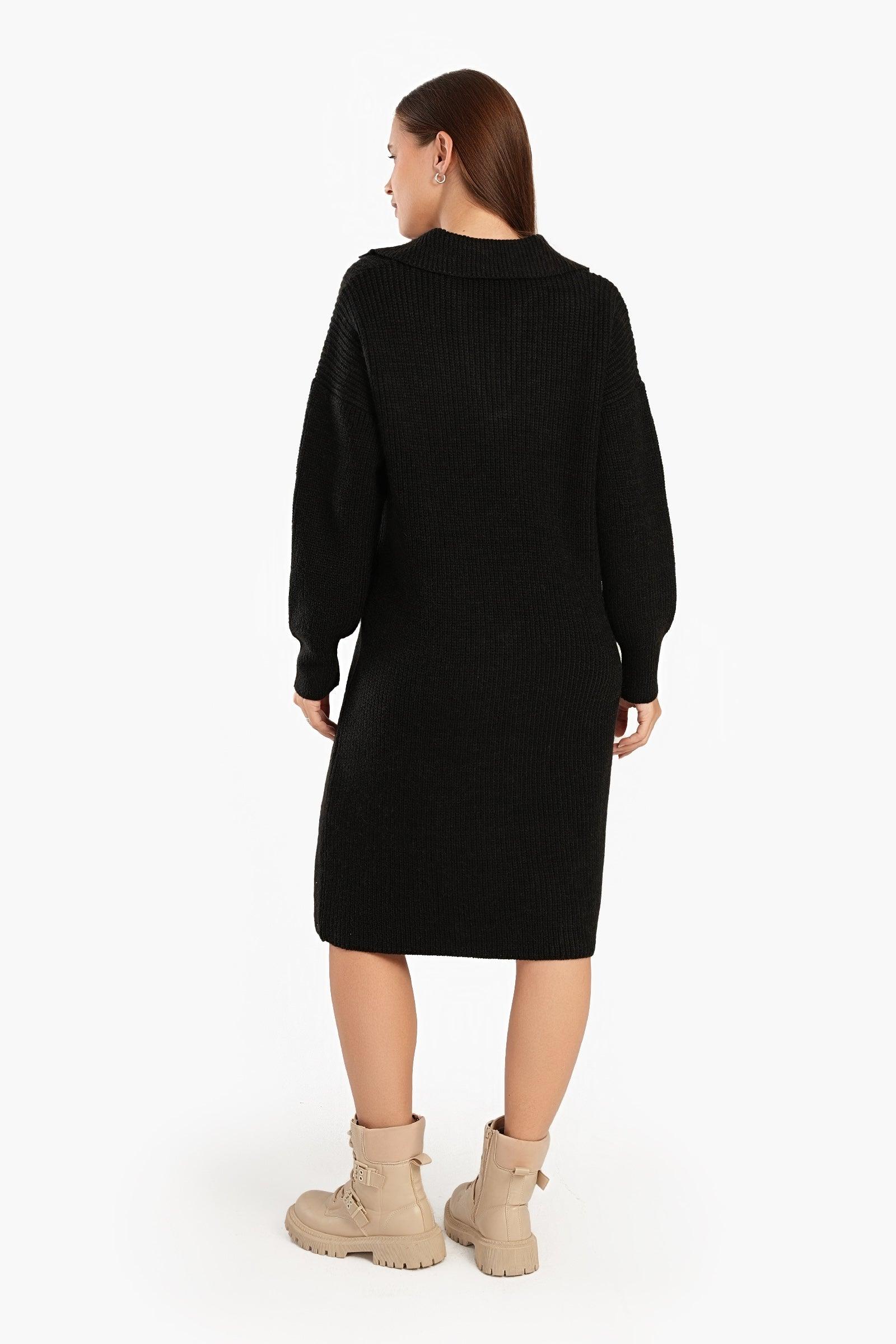 This wool dress combines warmth and effortless style, making it a must-have for cozy, chic dressing. Crafted in a relaxed fit with a soft knitted pattern, it drapes beautifully for a comfortable, flattering silhouette. The collared V-neck adds a hint of sophistication, while the long sleeves and dropped shoulder design enhance its laid-back vibe. Falling below the knee, this dress is ideal for both lounging and casual outings, offering the perfect blend of comfort and elegance. Slip it on for an instant, polished look.