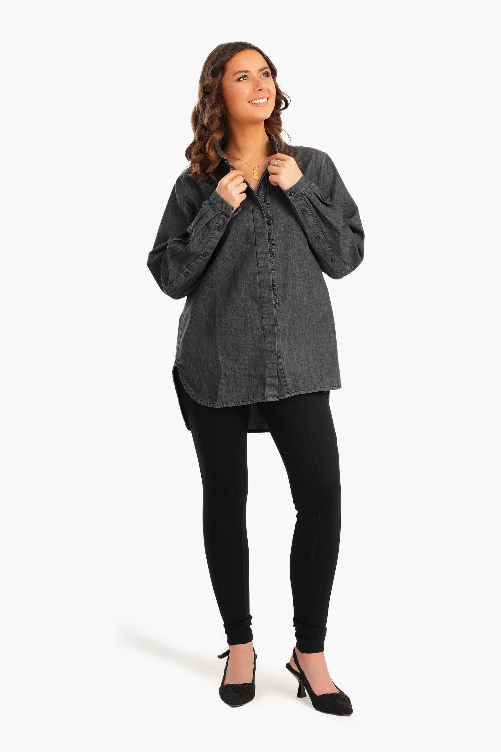 The collared neck and button-down closure give it a classic appeal, while the full hidden placket with small ruffles adds a touch of feminine charm. The long sleeves are adorned with four buttons, allowing for adjustable cuffs and a versatile look. The asymmetrical design and round hemline create a unique silhouette that sets this shirt apart from the rest.