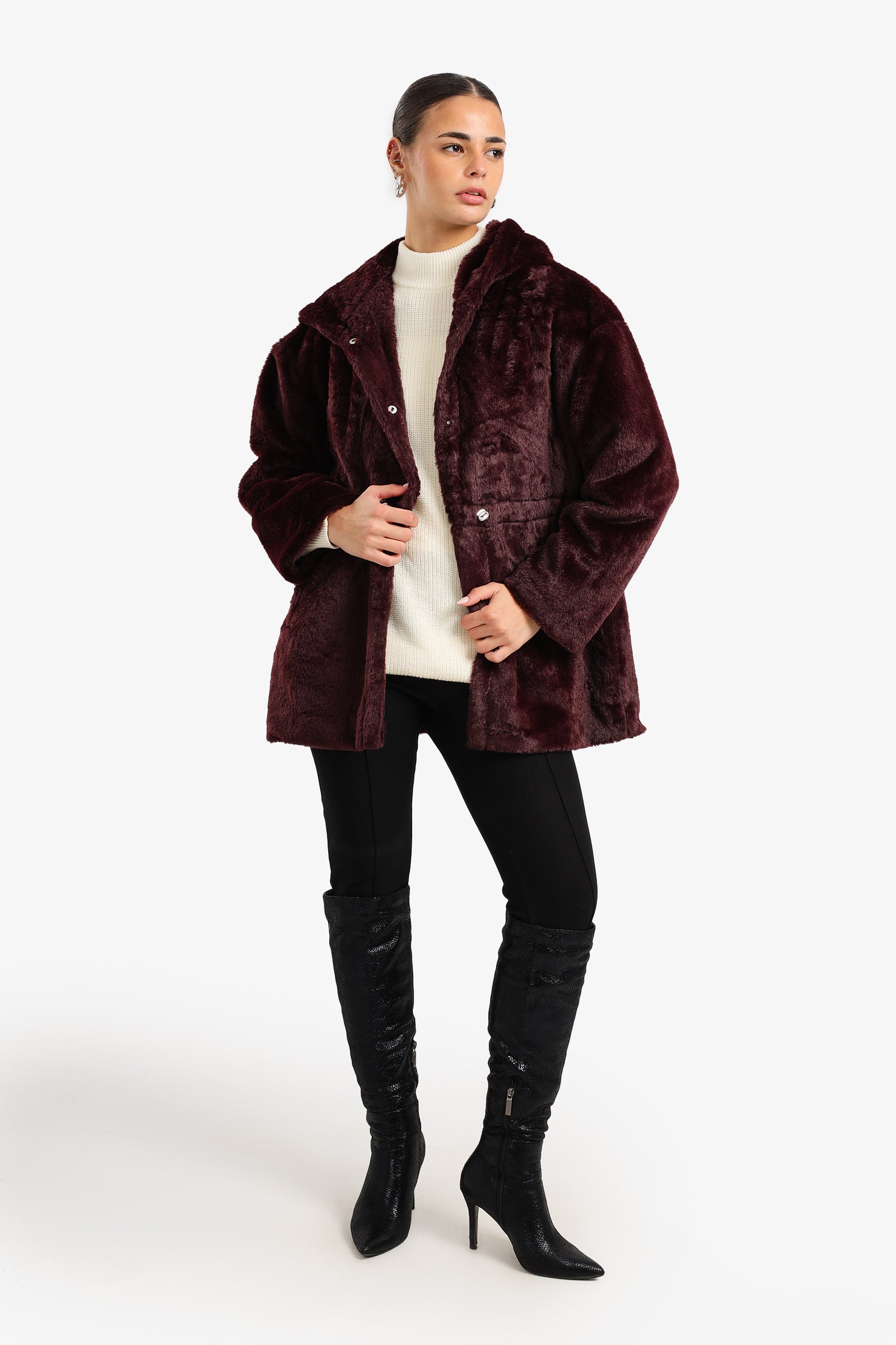 Stay warm and stylish with this plush faux fur jacket, designed for ultimate comfort and effortless layering. It features a relaxed fit and a cozy hood that adds extra warmth on chilly days. The soft, textured finish gives it a luxurious feel, while the front snap-button closure and adjustable drawstring hem ensure a secure and customizable fit. Perfect for pairing with jeans or dresses, this mid-length jacket brings a chic, cozy touch to your winter wardrobe.