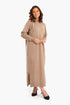 The high neck and long sleeves provide warmth, making it an ideal choice for cooler days. Ribbed edges at the neck, cuffs, and hemline add a refined touch, while the ankle-length design and side slits create a sophisticated, flowing look. Easy to slip on, this dress is both practical and chic.