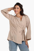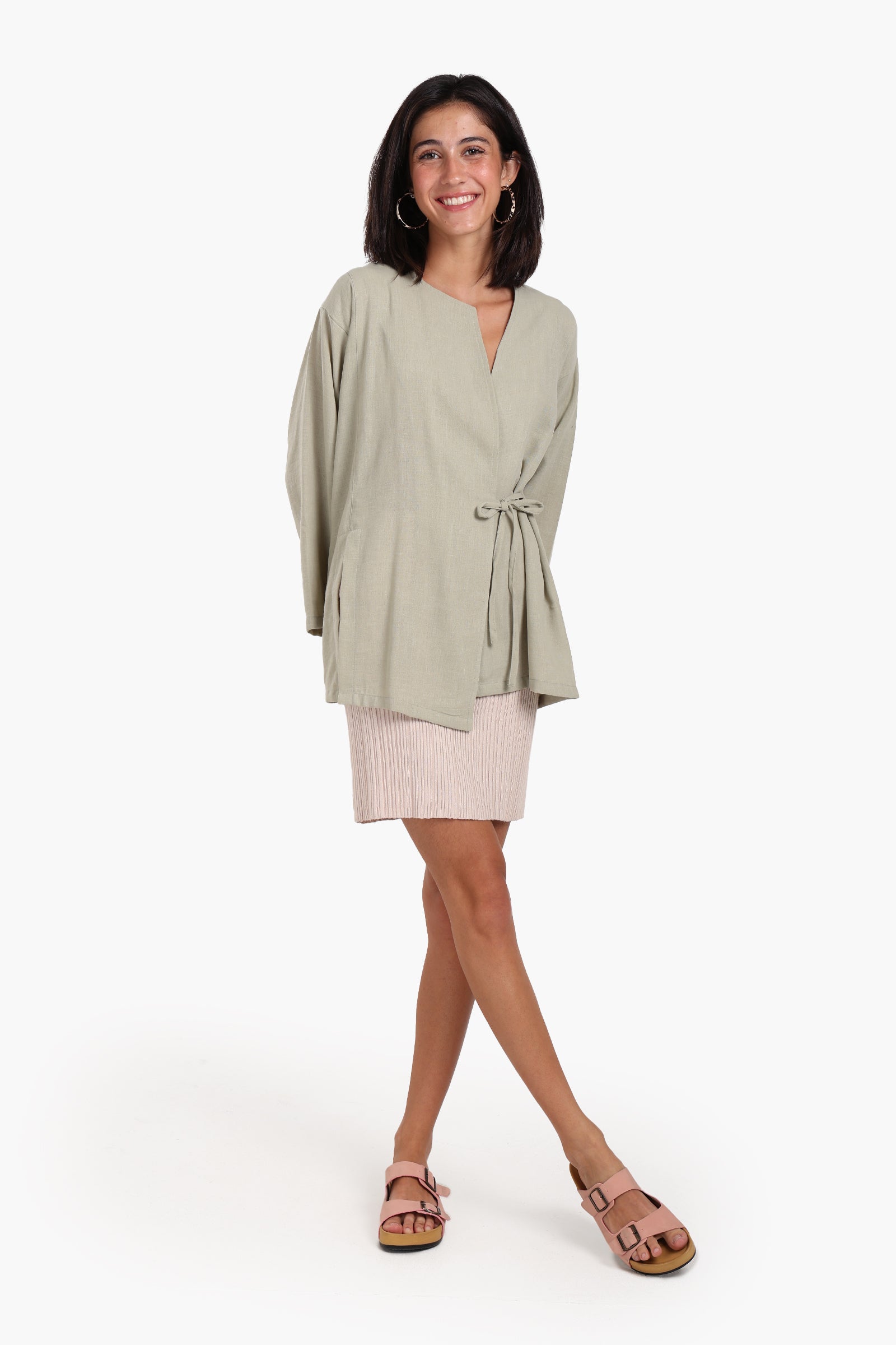 This wrap-style kimono blends relaxed elegance with thoughtful detail. Made from breathable Tencel, it drapes effortlessly in a relaxed fit, featuring a flattering V-neckline, hip-length cut, and long sleeves for year-round wear. The wrap silhouette with side tie allows for custom comfort, while subtle button detailing at the back and side slits add depth and ease of movement. Simple to style, endlessly versatile.