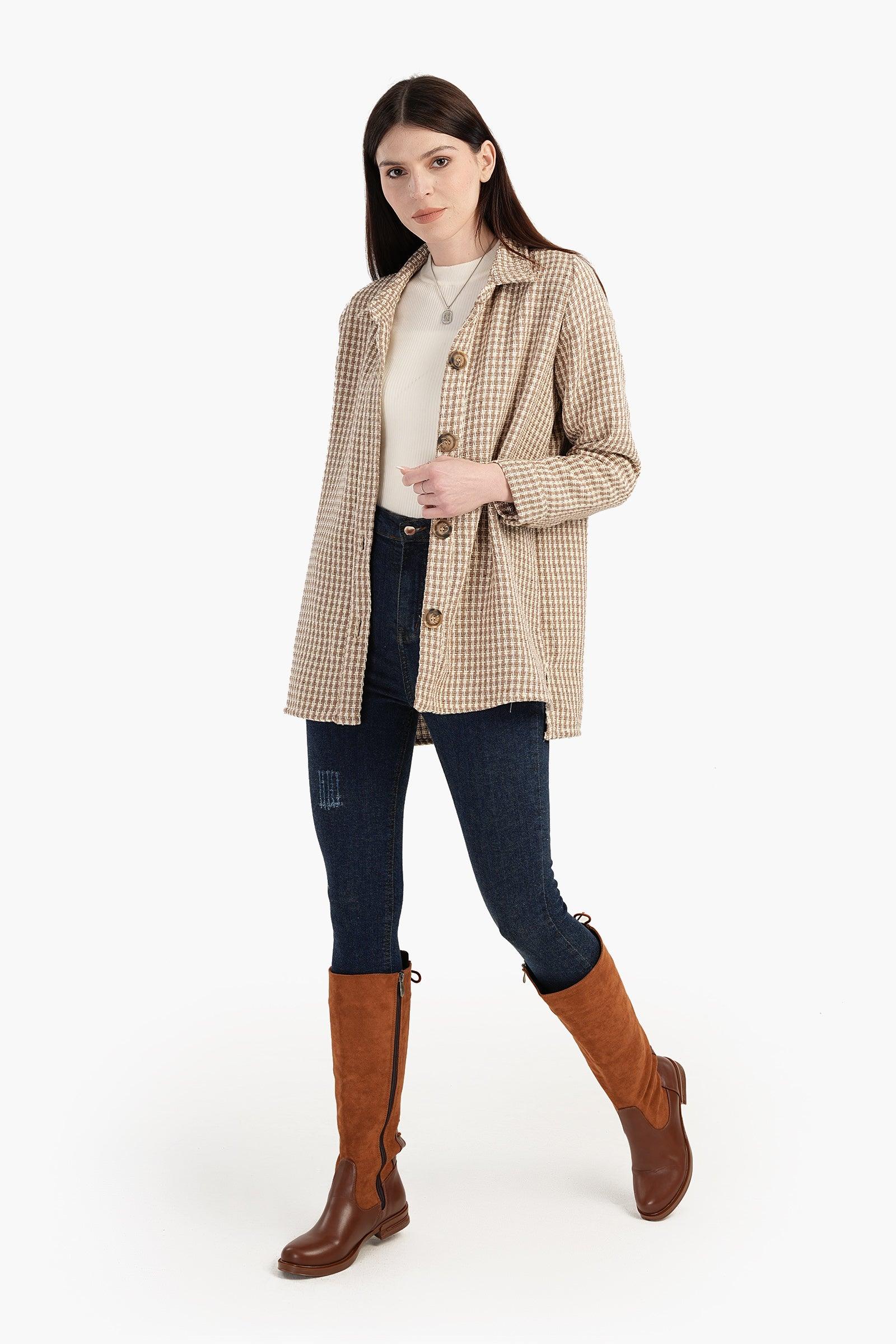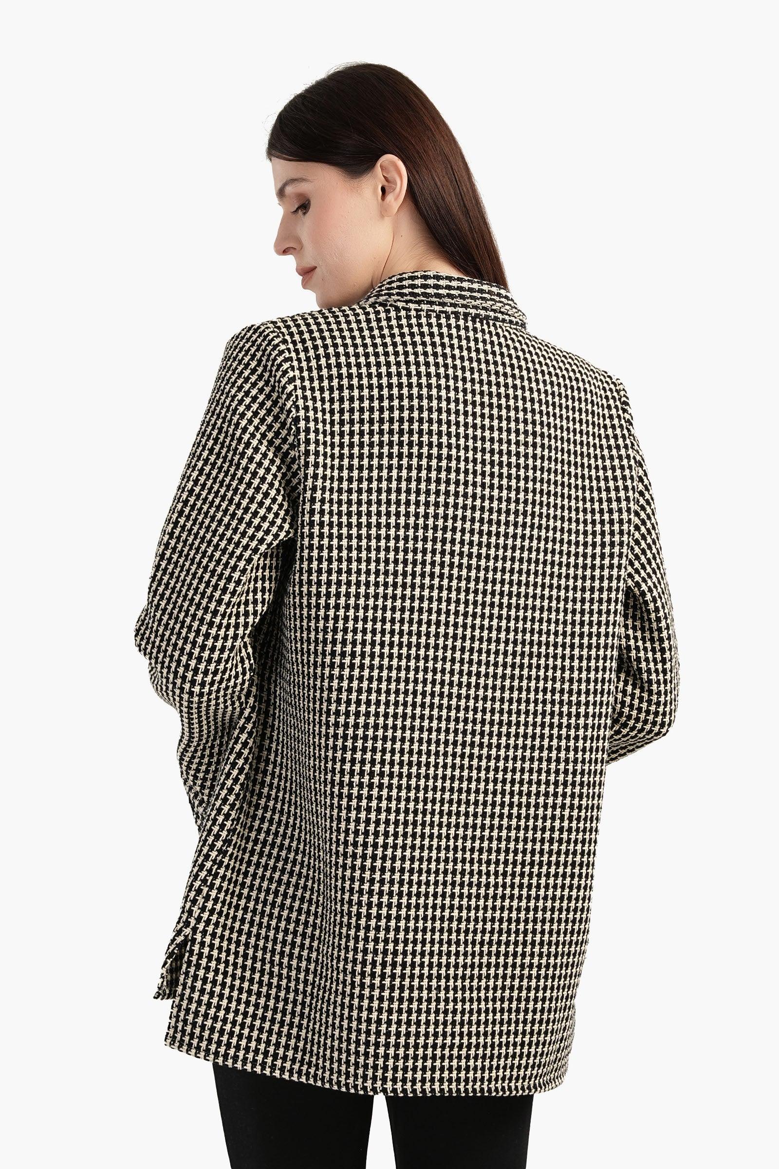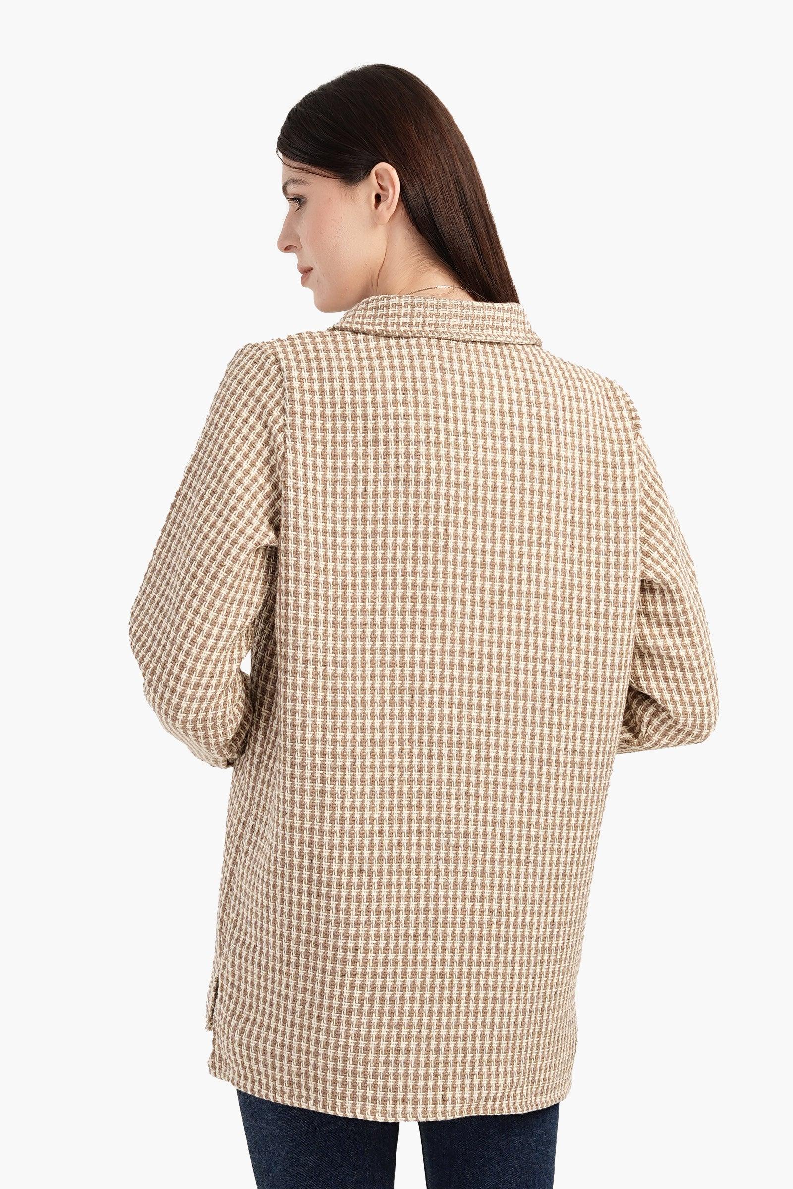 Elevate your wardrobe with this chic tweed shirt, a perfect blend of classic sophistication and modern design. Made from premium tweed fabric, this shirt offers a textured, stylish look while ensuring comfort with its relaxed fit. The collared neck and full button placket exude timeless elegance, while the asymmetrical design and side slits add a contemporary edge. With long sleeves and an easy-to-wear construction, this shirt transitions effortlessly from casual to formal settings, making it a versatile piece for any occasion.